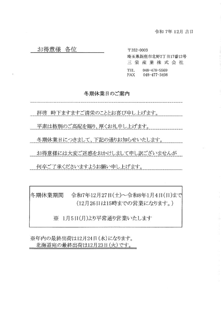 本年も押し詰まってまいりましたが、2025年は皆様にとってどの様な一年でしたでしょうか。インフルエンザなどの感染症が流行しております…期間中も皆さまどうかご自愛くださいませ。冬季休業のお知らせの詳細については、添付資料をご確認ください。来年も皆様にとって良い年になるようお祈り申し上げます。どうぞよいお年をお迎えください。 \ 最新情報をチェック /